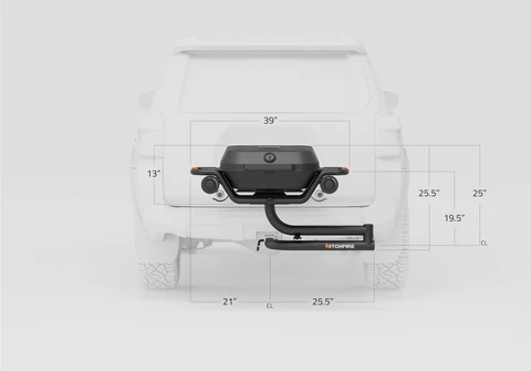 Attaching to any standard 2” hitch receiver the F-20 features a pivoting swing arms that allows you to rotate the grill up to 180° to access your bed and cargo.